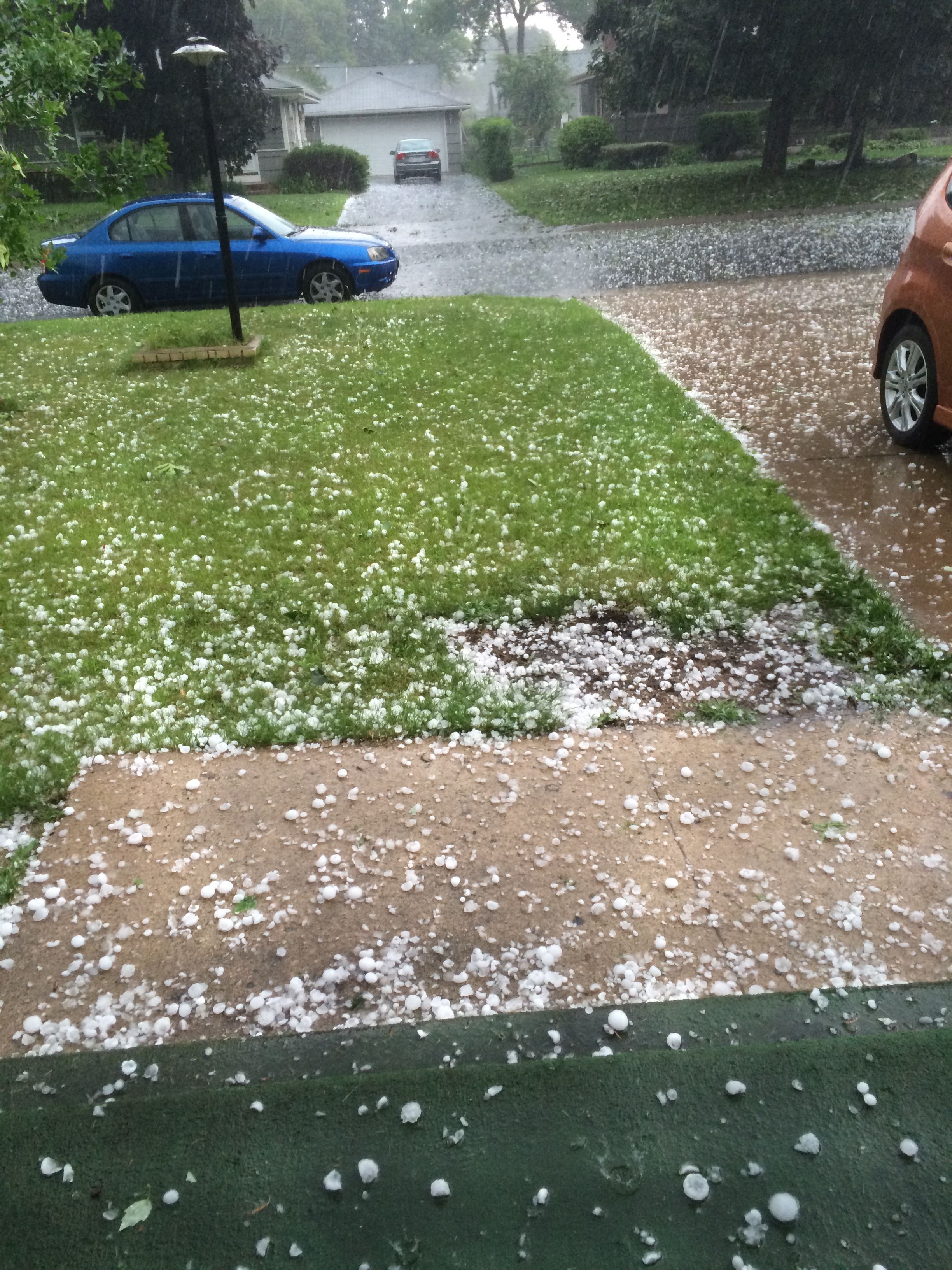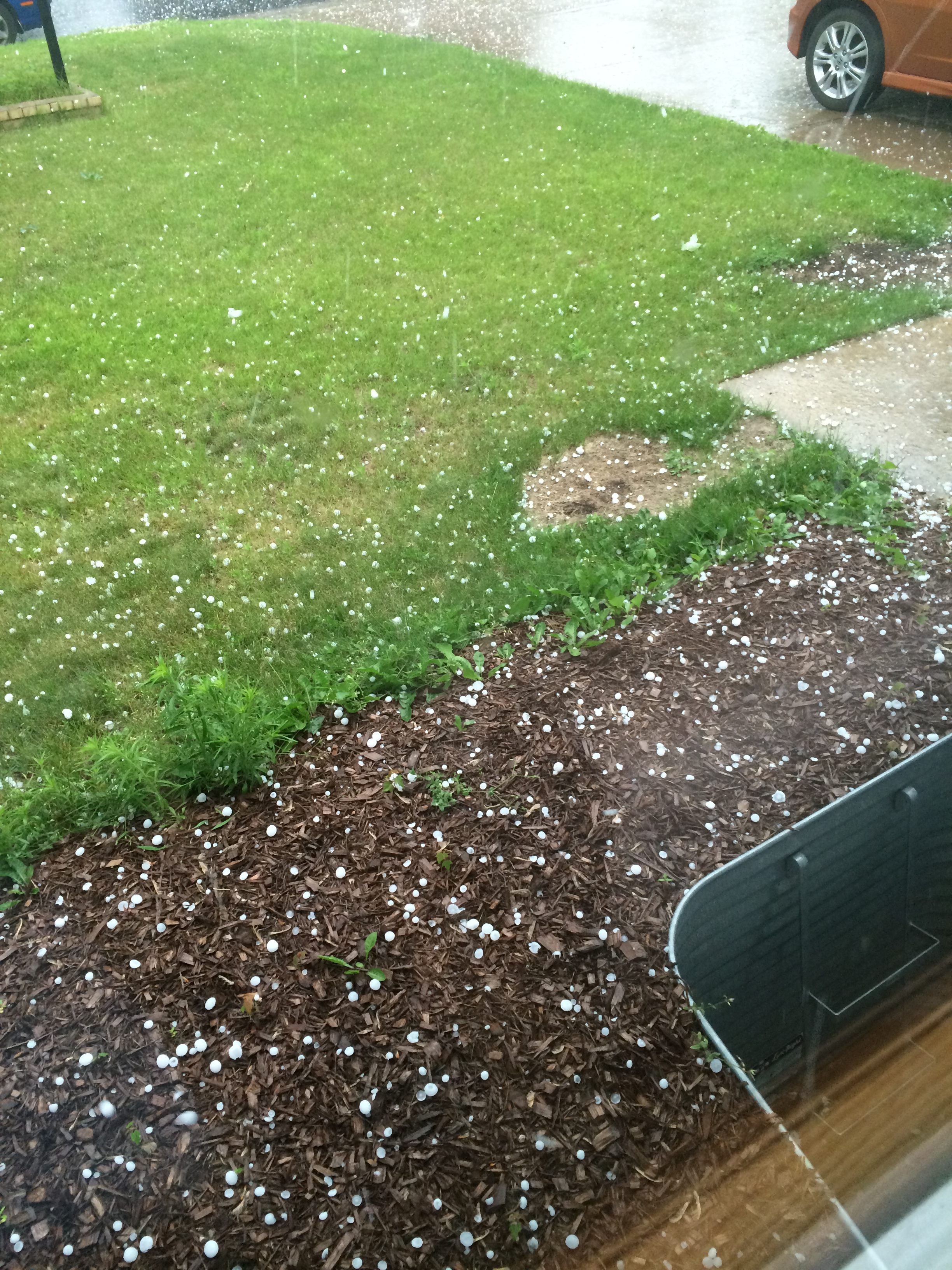Tonight we got home from some dinner in the nick of time. Within a couple minutes of parking our car at home the hail began. I thought, “Hm, this stinks because the cars are in the driveway. Oh well at least it’s not large hail.” That thought was short lived as golf ball sized hail started to rain all over our cars and our house. Once everything stopped, a good 5-6 minutes later, I went outside to survey the damage.