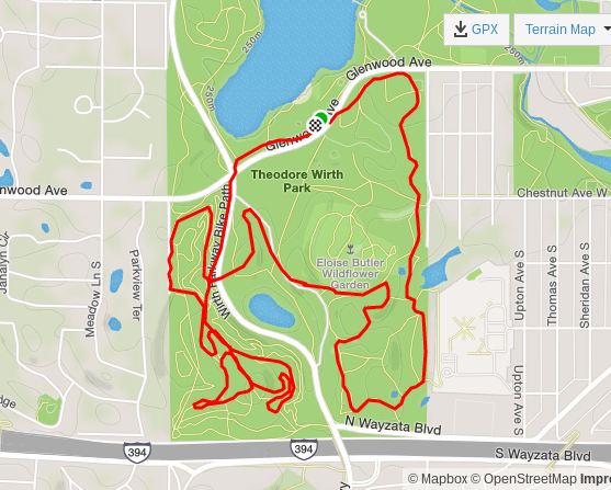 There is a park in Minneapolis called Theodore Wirth Park. I often see people online who talk about running the trails that they have, however, until today I had never been there, at least not in any significant way. My wife and I had made an attempt to explore the park, but as I discovered, we were on the wrong side, and only managed to find a mile or so of mountain bike trails.