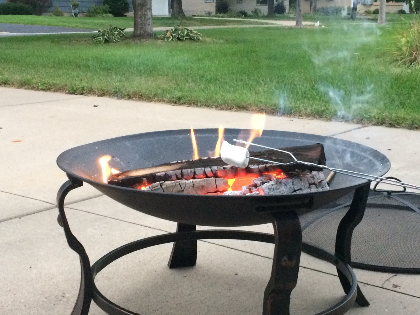 This past weekend we visited a friend and hung out in his driveway with him and his wife, had a few beers and relaxed. He has a fire pit and so we all got to relax around a nice warming fire. After our recent camping trips it made my wife and I realized how much we enjoy sitting by a fire in the evenings. I recalled seeing fire pits at Home Depot over the weekend, so on Monday night I picked up a $30 bowl type fire pit, and the last two nights we’ve enjoyed sunset with a fire.