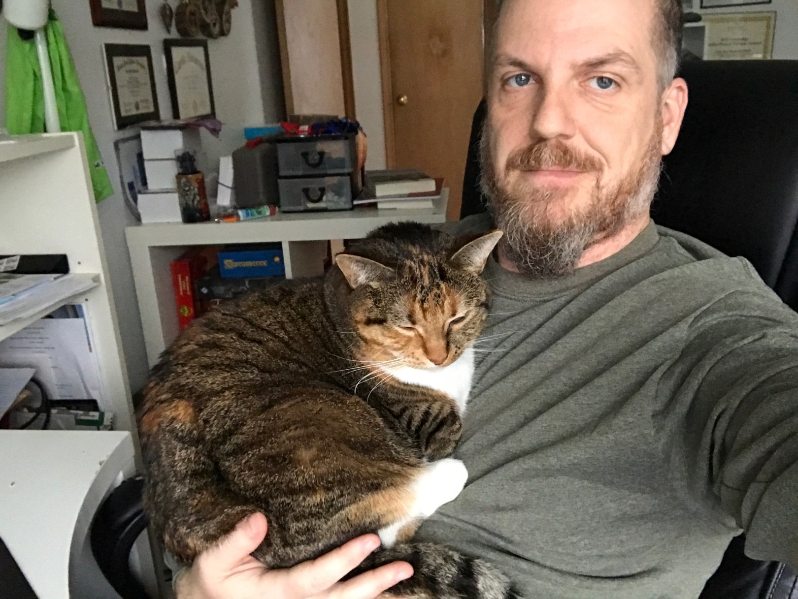 Then a few weeks ago she started getting nosy while I was working at home. She was walking all over my desk, and so I picked her up, leaned back in my chair, and put her on my chest to give her some cute chastising. She took a look at me, decided she had the upper hand, and proceeded to lie down on my chest while one of my arms held her in place.