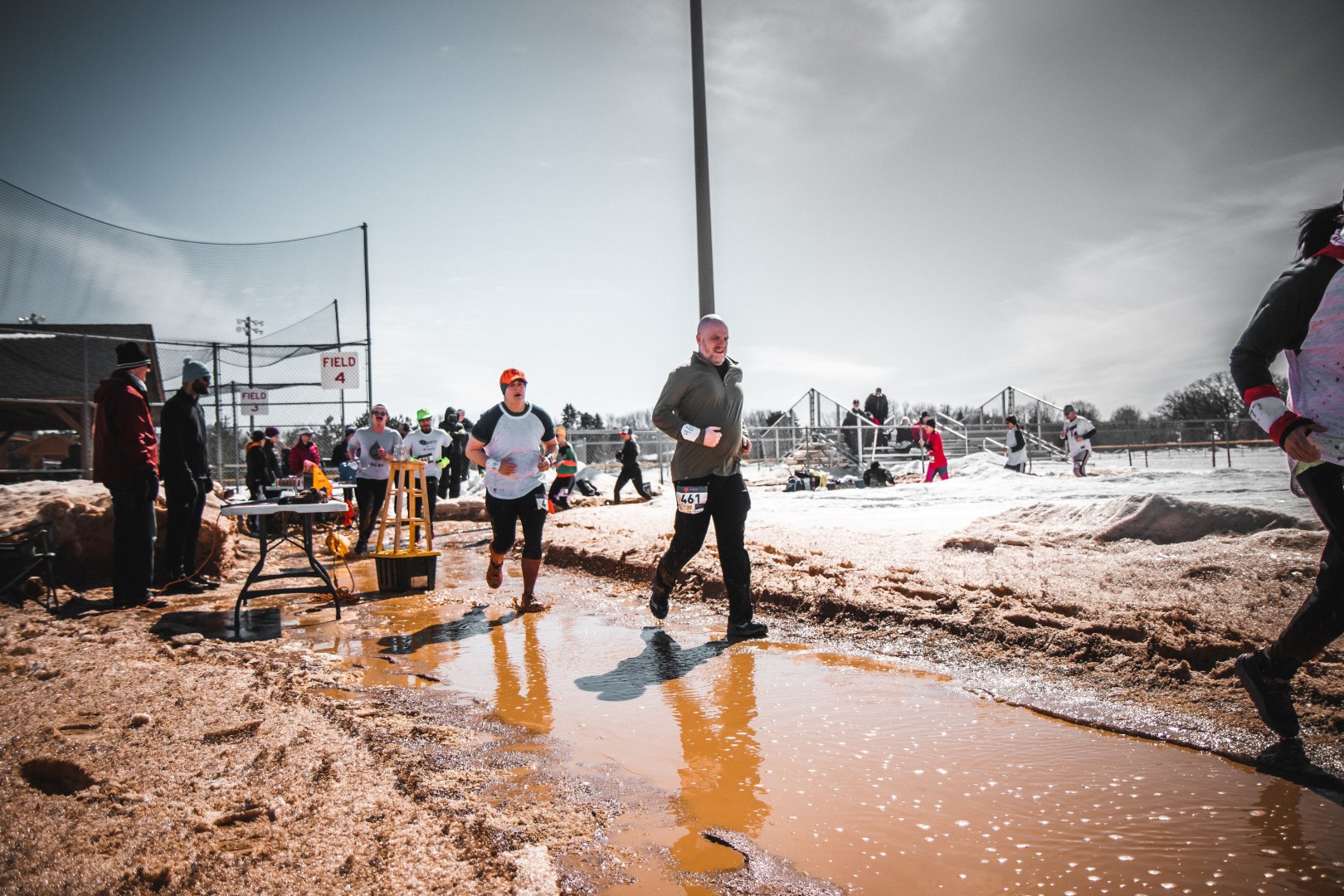 I hung out with friends and tried to relax, but eventually 12:15 hit and it was time to start my journey. I started out with the pack, probably going just a little too fast, before easing into a nice steady pace. Rounding the bases didn’t seem too bad at first. I was able to chat with people and distract myself pretty regularly throughout the race. However, the real story of the day was the condition of the field. Our massive snowfalls had yet to melt, and so the path that had been cleared on the baselines was covered with water that had no where to go. Within 10 laps my feet were soaking wet.