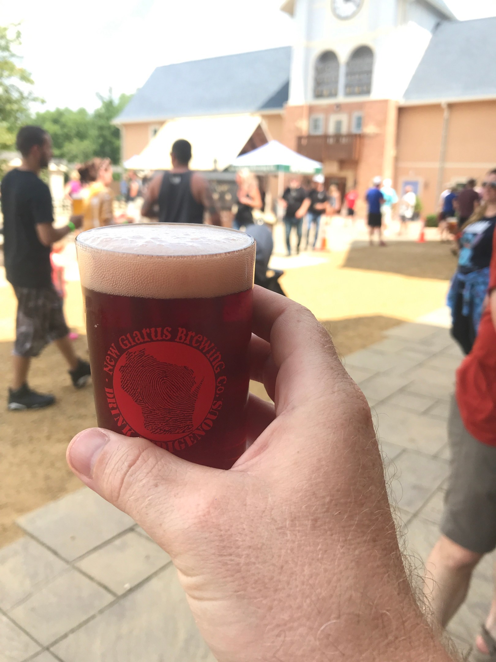 The way that New Glarus works is that you go up to the beer garden, and you buy tickets for your beer. You can get either a sample glass for $8 and 3 pours, or a full pint, and then purchase tickets for each pour you want. I opted for the sample glass and got my wristband with three pull off tickets on it. The cool thing about this is that you get to keep the sample glass as a souvenir. This does really emphasize the “destination” aspect of New Glarus though, and not that it would be a place you’d swing by for a pint after work.