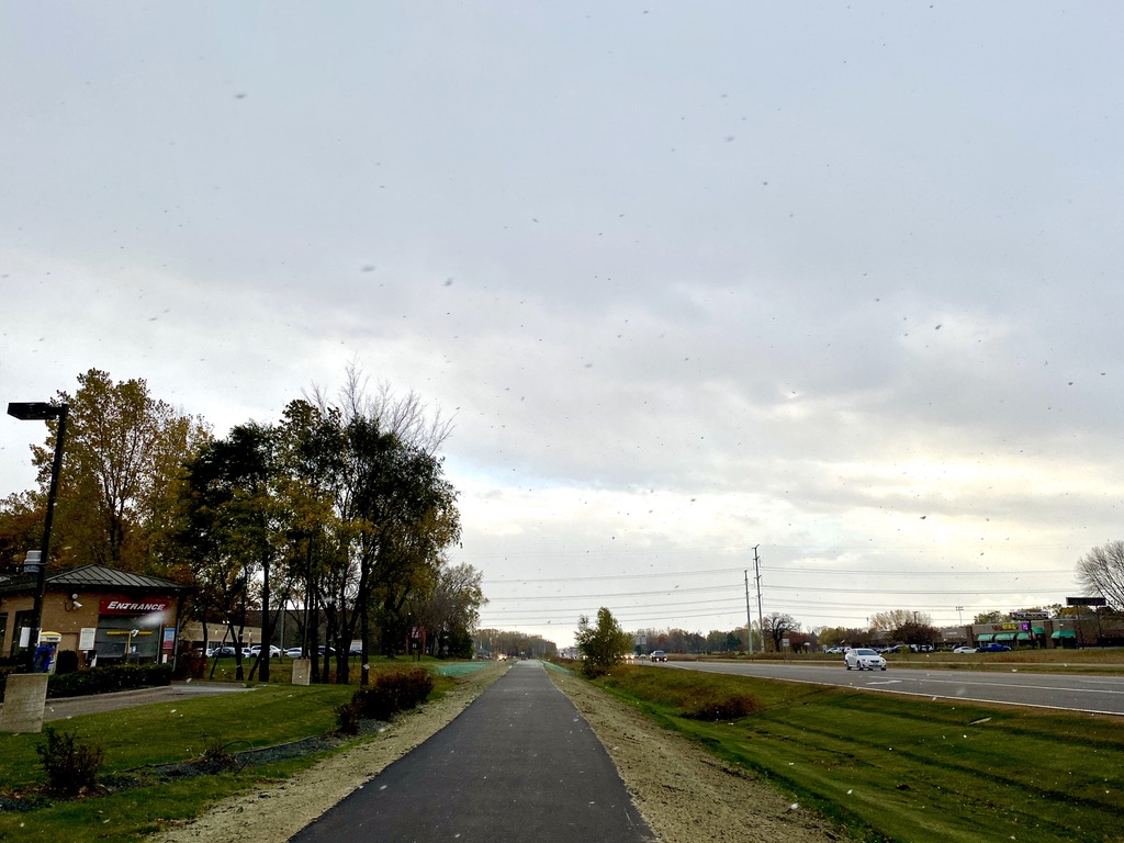 As I walked, the small blizzard picked up its intensity, ever so slightly. Because it wasn’t quite winter yet, the flakes became more akin to sleet, but it still looked enough like snow for me. I stopped at a park shelter to take a quick video, and savor in a peaceful moment (except for the construction trucks backing up a block away).