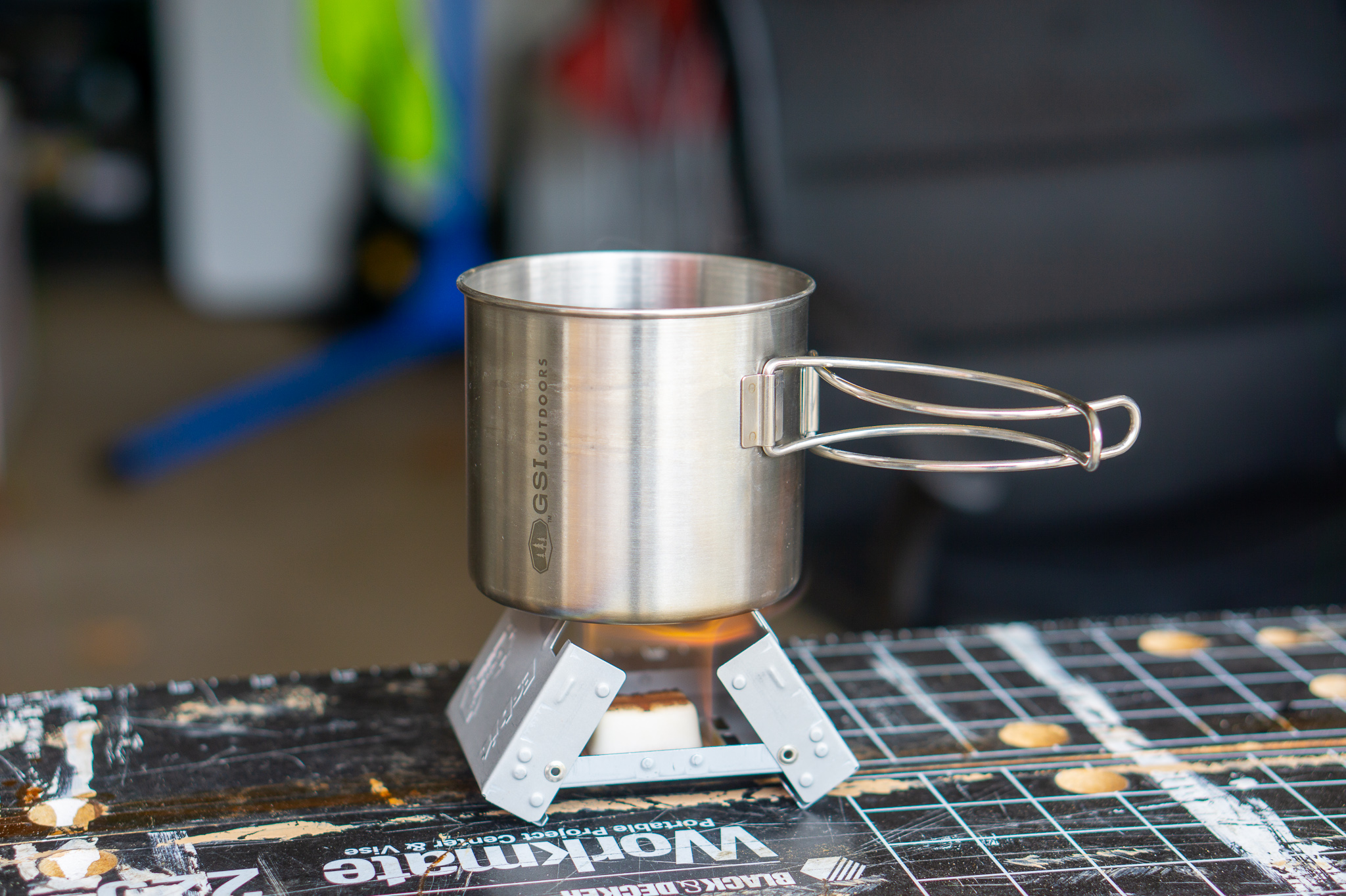I quickly extinguished the entire fire with some room temperature water (ESBIT’s die really fast in water) and carefully set the stove on the driveway to cool. My workbench had a couple scald marks, but, thankfully, seemed no worse for wear. I got everything cleaned up and decided I wouldn’t repeat this test. At least not with the current ESBIT stove that I own (pocket stove).