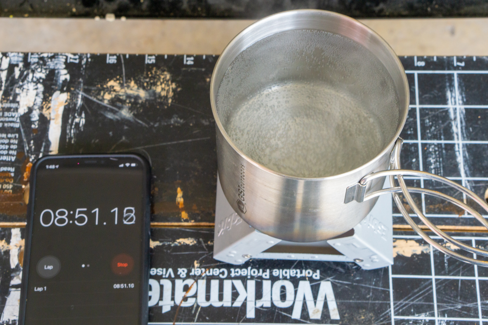 For each test I set up just inside my garage with an air temperature around 52°F (11°C) and very, very light wind. I used a stainless steel GSI Glacier pot, and 2 cups (16oz/472ml) of room temperature water.