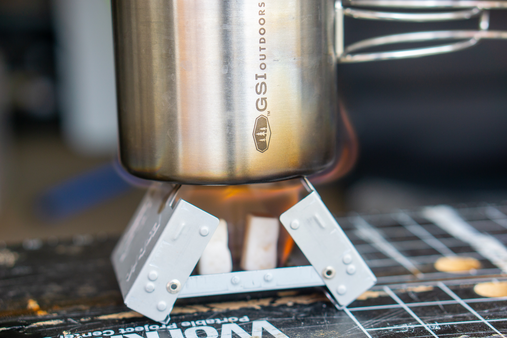 I reached the small bubble phase between 2-3 minutes, but then I noticed a problem. The bottom of my ESBIT stove has holes in it for ventilation, and the ESBIT tablets were starting to melt through these holes and onto my workbench. I started seeing flames coming from under the stove and decided that this test was over.