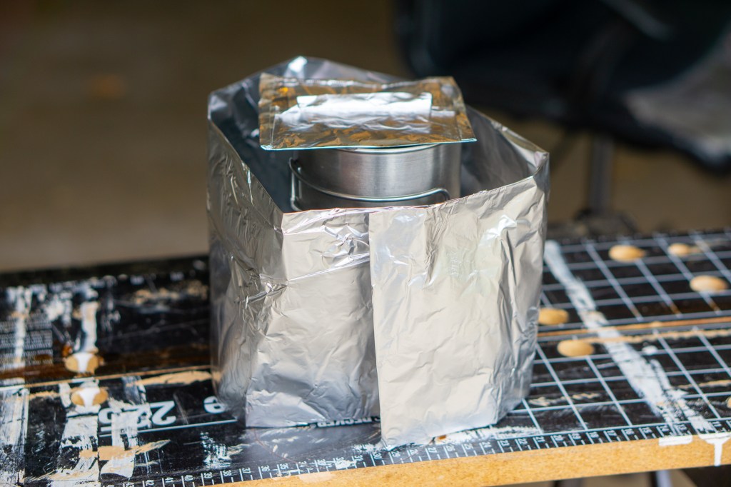 For this test I fashioned a simple wind and heat shield out of aluminum foil, and made sure it was high enough to not just cover the stove and protect it from wind, but also provide a heat barrier around the pot itself. The rationale is that by trapping heat around the pot, you diminish the energy loss of the system overall. This means your tablet provides way more heat in a lot less time.