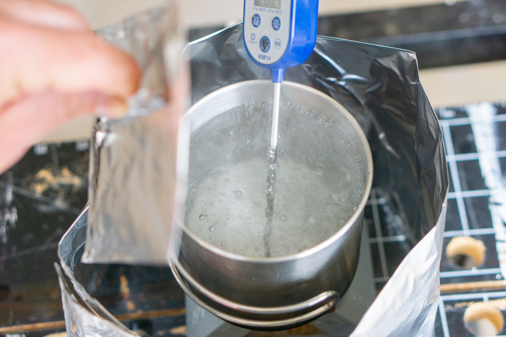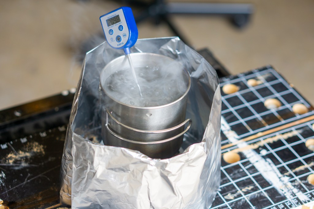 The second test was the same as the first, but with an aluminum foil top to the pot. Many pots come with covers, but since I was using a steel cup, I had to fashion one on my own. The design of the lid isn’t the most important thing, simply stopping heat from escaping is the key.