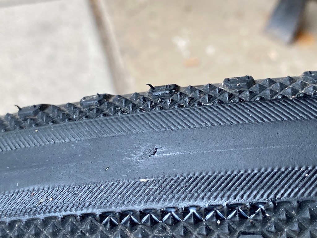 With this success under my belt I went ahead and tried changing out my wife’s spare wheels to tubeless. They came pre-taped from the factory which made the job super quick. The first tire was done in record time and is holding pressure solidly. The second tire however brought up a new problem. I had forgotten that my wife had a flat tire when she last used this wheel and it was due to a pretty severe puncture from glass. I got the second tire seated with the air compressor, tossed in some sealant, and started hearing hissing. I rotated things around a bit and discovered the troublesome hole.