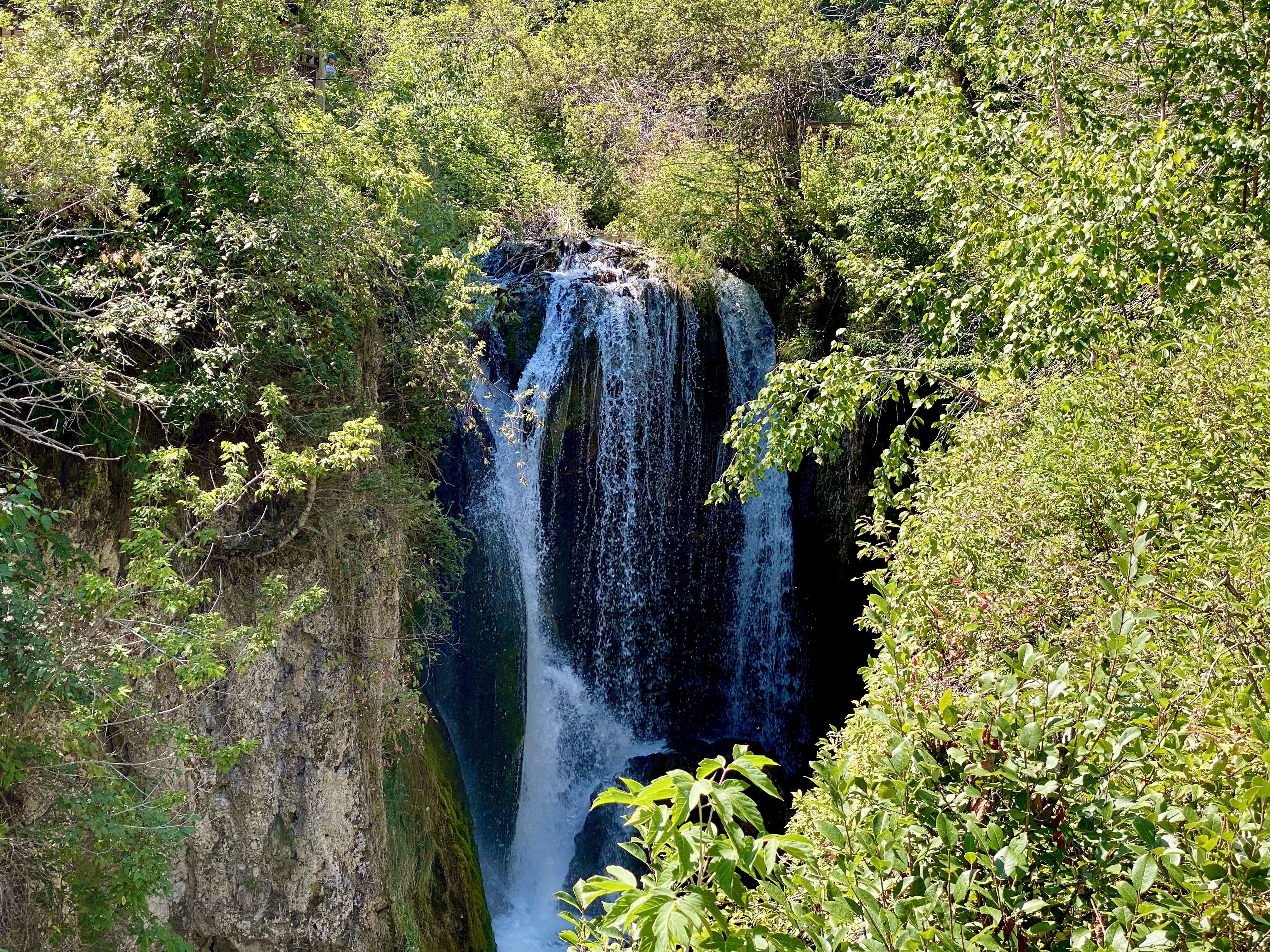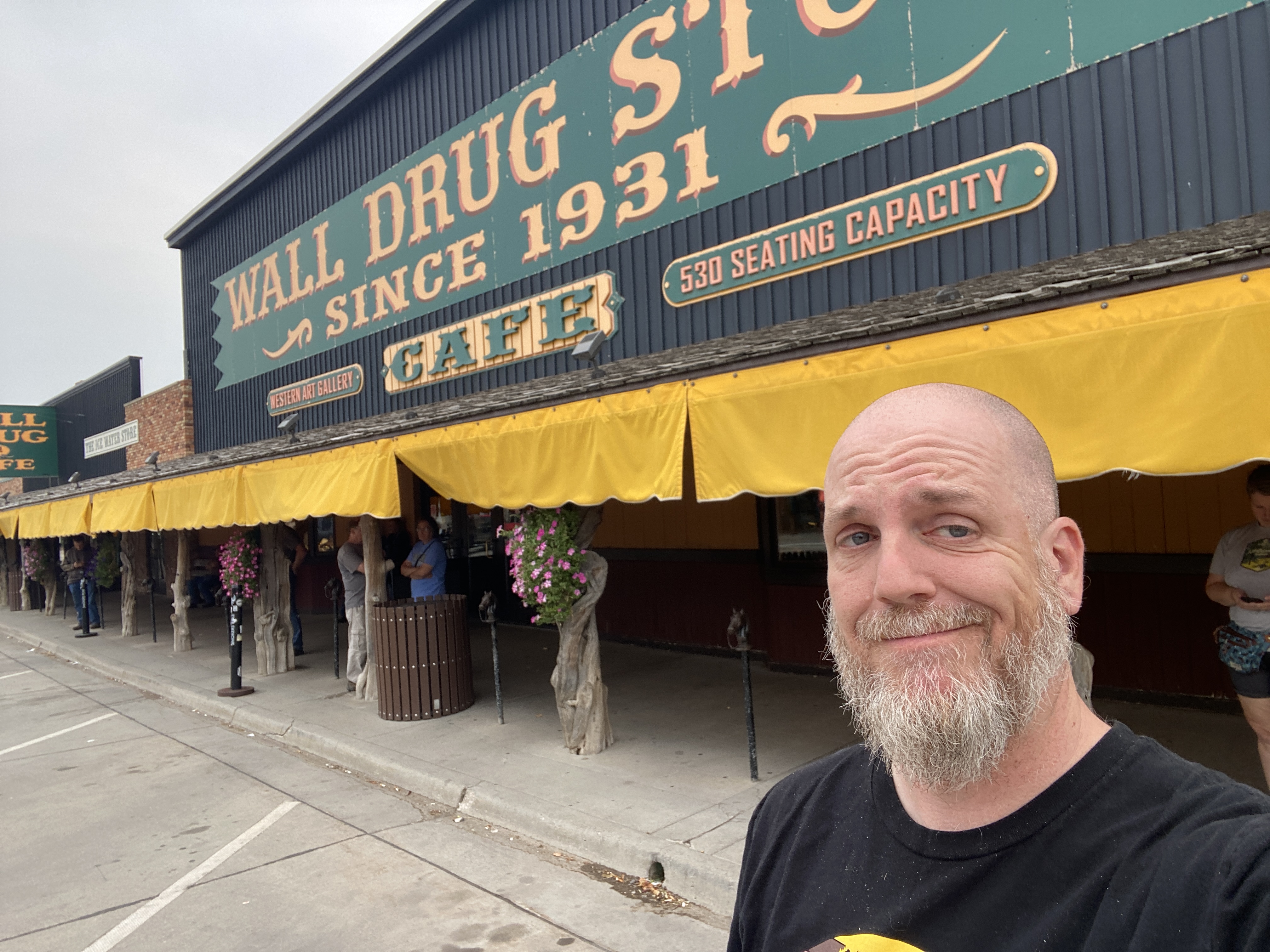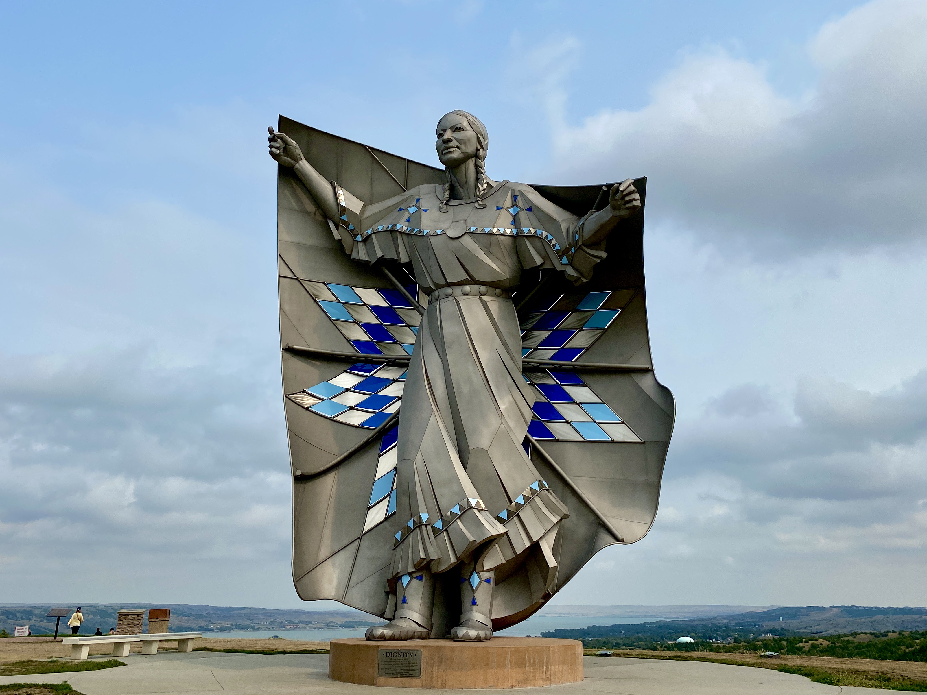 Although our fourth day was consumed by a 9 hour drive we did partake of a couple quick stops. This included a first in my life stop at Wall Drug. Before anyone criticizes, we were lured in by signs touting fresh donuts. Our visit consisted of waiting for 5 minutes until the doors opened, grabbing a couple donuts, and hitting the road again. However… WOW those donuts were amazing. That was probably the best maple glazed donut I’ve ever had. Perfect crispiness on the edges and the glaze wasn’t overly sweet. Really happy about that stop. Secondly, we took a rest at the Dignity: of Earth & Sky statute. This is an amazing piece of artwork honors that Native cultures of the Dakota’s and is breathtaking to view. Perched on the banks of the Missouri River it glints in the sunlight and is beautiful from any angle.