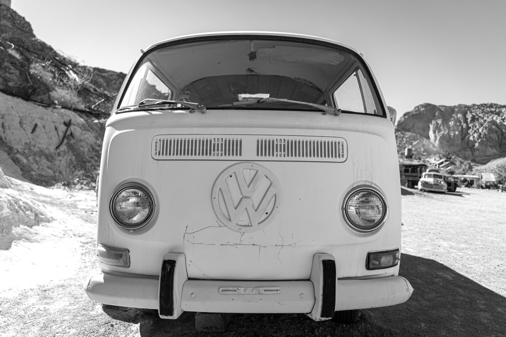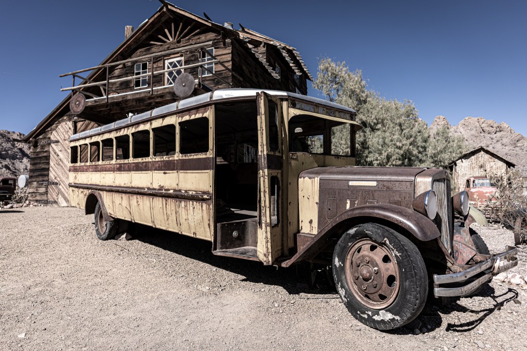 We’re getting the opportunity to visit some interesting sites out here in Nevada while we’re here for a couple of weeks. This past weekend we visited Techatticup Mine (sometimes known as Nelson Ghost Town) which is on the way through Eldorado Canyon. This attraction is an old mining town that is filled with original buildings as well as old vehicles and equipment. When I heard about this place I knew I wanted to use the wide angle lens and capture some perspective shots in B&W and highly desaturated. The clear sunny day was perfect for high contrast, and all the old cars and buses did not disappoint.