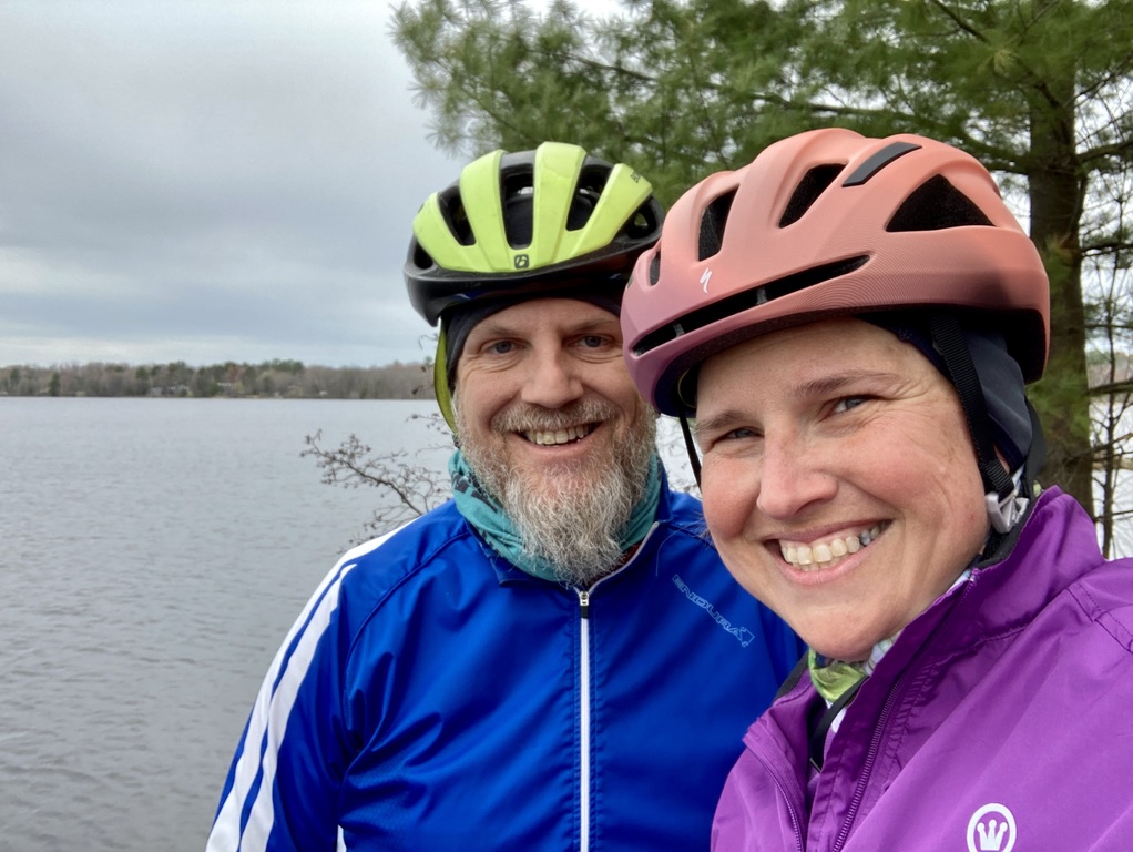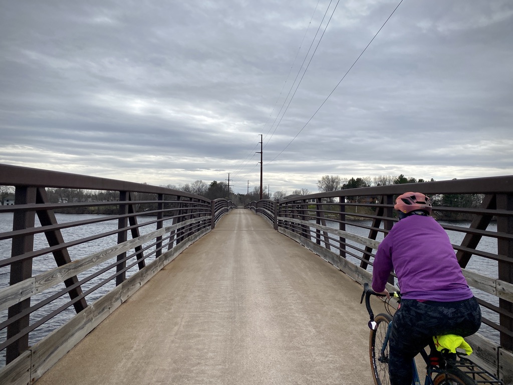The Old Abe Trail is a 20 mile rail trail that goes between Chippewa Falls and Cornell in Wisconsin. Because of its railroad origins, the only elevation is slow climbs and descents, usually never more than 1% grade. The trail has long straight segments giving rides a view of what’s ahead for miles at a time. This monotony is broken up by the changing terrain, from pedaling along a lake to farm fields and small towns. We parked at the north end of the Riverview Reserve Park and picked up the trail from there.
