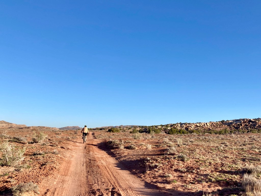 We arrived in Moab on Sunday and van-camped at the North Klondike Campground. This is a mostly primitive campsite (vault toilets but no water) about 25 miles north of Moab proper. It’s also situated at the trailhead for some incredible singletrack at Klondike Bluffs. As we started to head out for a quick evening ride I discovered that my new rear brakes were waaaay too squishy and needed to be bled. I didn’t have a kit or fluid with me, so Monday’s task would be to head into town and get that taken care of. I had just enough braking power to go out on a small one mile warm-up loop, but the lack of stopping power made me very tentative and hesitant.