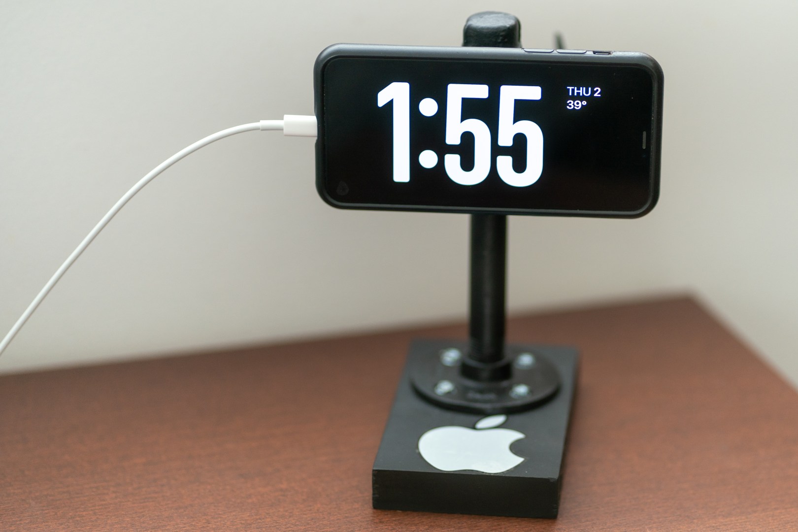 Once I got it configured I started trying to figure out how to mount my phone sideways next to my bed. I tried a couple of methods of propping it up, but since I have an iPhone 11 and need to gently tap the screen to get the clock to show, it invariably tipped over when checking it in the middle of the night. The primary option out there is to use a MagSafe stand that holds the phone up using magnets on the back, and charges it wirelessly. However, I keep my phone in an SP Connect case since I often am mounting my phone on my bike or on an SP Connect holder in my van. The SP Connect component gets in the way of the magnets and so I’m back to looking for options.
